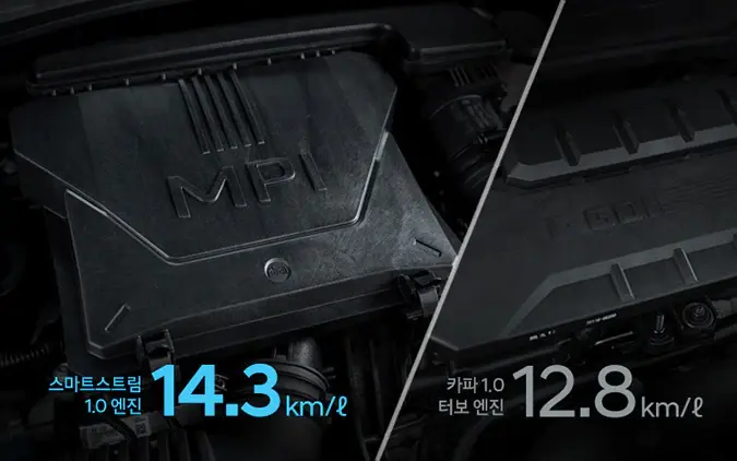경형 SUV에 최적화된 효율성을 제공하는 스마트스트림 가솔린 1.0엔진으로 파워트레인 구조 설계 최적화, 연소 기술 강화, 신기술 적용 최적화, 부품 소형화 및 경량화 등을 통해 다이내믹하고 재미있는 드라이빙을 선사합니다.