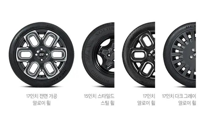 * 캐스퍼는 트림 변경과 선택 품목 추가로 15인치 스타일드 스틸 휠 외에도 17인치 알로이 휠과 17인치 전면 가공 알로이 휠, 17인치 다크그레이 알로이 휠을 선택할 수 있습니다.