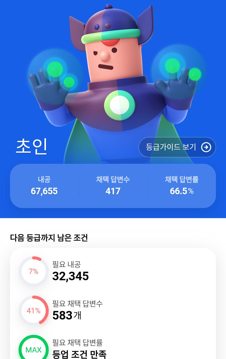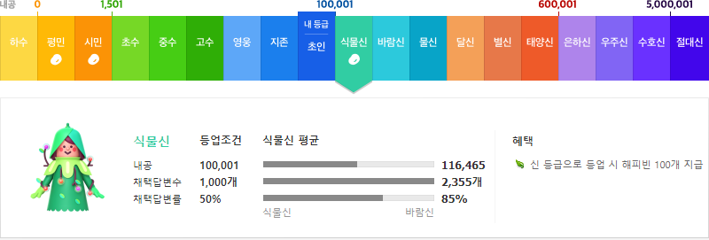 꾸준히 하는 것도 힘들고, 하루에 100개를 답변하는 것도 여간 귀찮은 일이 아니므로, 결과적으로 엑스퍼트가 되기 위해서는 매일 답변을 한달동안 반복해야 된다는 계산이 나온다. 내 경우에는 이제 지존 등급에서 초인 등급이 되었고, 마지막 조건만 채우게 되면 최소 신 등급인 식물신이 된다.
