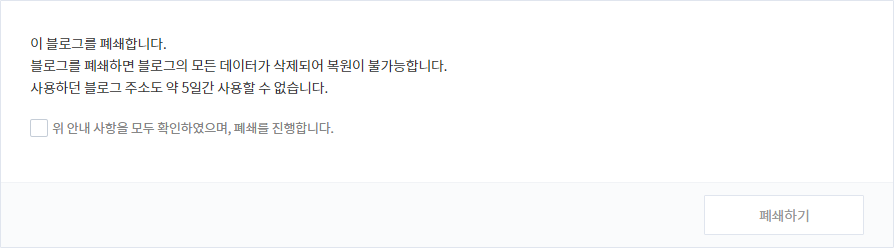 블로그 폐쇄를 진행하고 로그인 한 계정의 이메일에서 다시 한번 확인을 하게 되면 티스토리 블로그는 완전히 삭제 및 폐쇄된다. 이를 통해 모든 데이터가 삭제되며, 다시 복원이 불가능하다.
