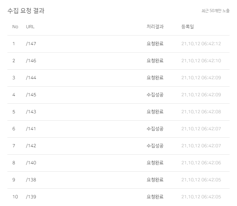 이러한 점을 고려한다면, 티스토리 블로그에서 문자보다 숫자를 사용해야 할 이유가 너무나 많다. 단순히 공유 주소 만으로도 백링크가 가지는 힘이 대단한데, 수집 요청에 있어서도 별도로 셀레늄을 통한 자동화를 하지 않는다면 위와 같이 수동으로 모두 주소를 입력해줘야 한다.