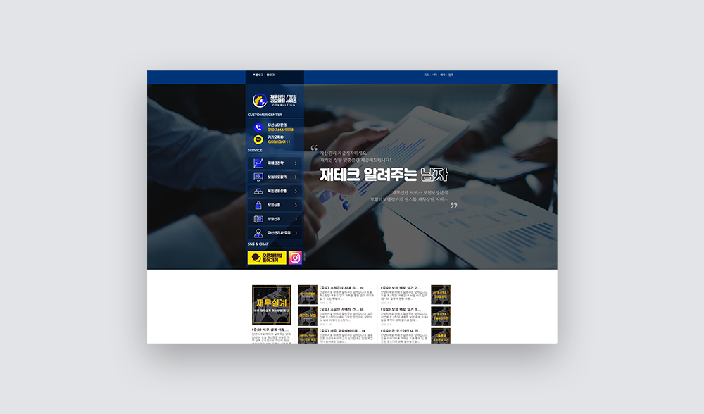 | 프로젝트 | 최근에 작업량이 많음에도 불구하고 포트폴리오를 정리할 시간이 없어서 포트폴리오 업데이트가 늦어지고 있습니다. 지속적으로 꾸준하게 업로드가 되고 있기 때문에 이전부터 최근 디자인까지 참고하여 디자인을 진행하실 수 있습니다. 뿐만 아니라, 고객님께서 원하시는 디자인이나 레이아웃 등이 있다면 최대한 고객님이 원하시는 것에 맞춰 제작됩니다. 작업을 진행할 때, 말로 전달하는 부분은 한계가 있기 때문에 레퍼런스 사이트나 샘플 이미지가 있으면 더욱 좋습니다. 곧 있으면 정신없던 1월도 끝이 나는 것 같습니다. 오랜만에 업로드되는 포트폴리오 홈페이지형 블로그디자인은 보험 관련 업종입니다. 이번에 작업했던 디자인의 경우에는 고객님께서 원하시는 스타일의 디자인이 있어 최대한 참조하여 디자인을 진행했습니다. 브랜딩이 느껴지면서도 세련됨이 느껴지게 디자인하였고, 전체적으로 깔끔해 보이면서도 필요한 내용은 전부 효과적으로 삽입될 수 있도록 레이아웃이나 구성을 신경 써서 작업을 진행했습니다. 왼쪽 메뉴바와 대비되는 오른쪽 타이틀 및 슬로건 부분은 너무 화려하지도, 부족하지도 않게 깔끔한 느낌으로 작업했습니다. 소셜 아이콘의 경우에는 인스타그램만 구현하였고, 고객님의 요청에 따라 카카오톡 오픈채팅방으로의 상담이 원활하게 이뤄질 수 있도록 한눈에 보일 수 있도록 구성하였습니다. |