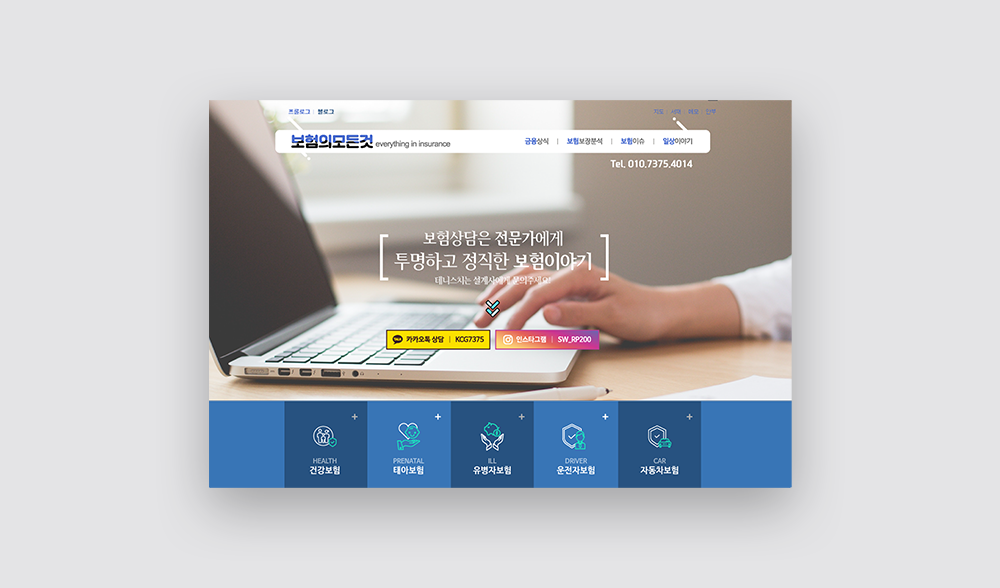 | 프로젝트 | 개인 홈페이지형 블로그 디자인으로 의뢰해주신 클라이언트의 요청에 따라 맞춤형으로 제작되었습니다. 블로그 제목은 보험의 모든것이며, 전문상담가의 느낌을 살리면서 깔끔한 느낌을 살려 제작된 홈페이지형블로그 디자인입니다. 5개의 메뉴로 메인 메뉴를 구성하였으며, 카카오톡 상담과 인스타그램을 메인에, 서브 카테고리는 우측 상단에 배치한 홈페이지형 블로그 디자인입니다. 전체적으로 깔끔하면서도 심플한 느낌을 살리고자 한 홈페이지형블로그 디자인입니다. PC버전으로 홈페이지형블로그를 보시면 메뉴가 선명하고 정갈한 느낌이 들면서도 전체적으로 따뜻해보이는 느낌의 컬러톤을 사용하였습니다. 주로 깔끔하면서도 따뜻한 느낌은 파스텔톤의 컬러가 많이 사용되며, 중간부분에 무채색 톤으로 컬러밸런스를 잡아줍니다. 그 중에서도 포인트 되는 컬러를 사용하여 중간중간에 엣지있는 느낌을 살리는 디자인으로 제작된 홈페이지형 블로그 디자인입니다. 보험 쪽의 관련 홈페이지형 블로그 디자인을 제작하고자 하시는 분들은 참고하시길 바랍니다. |