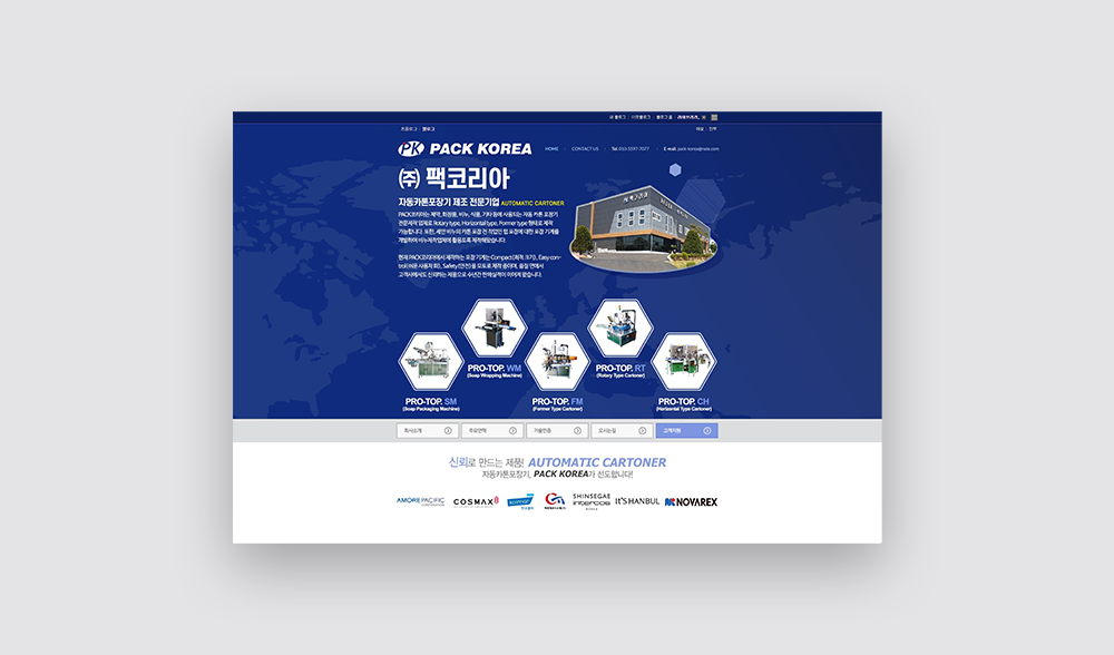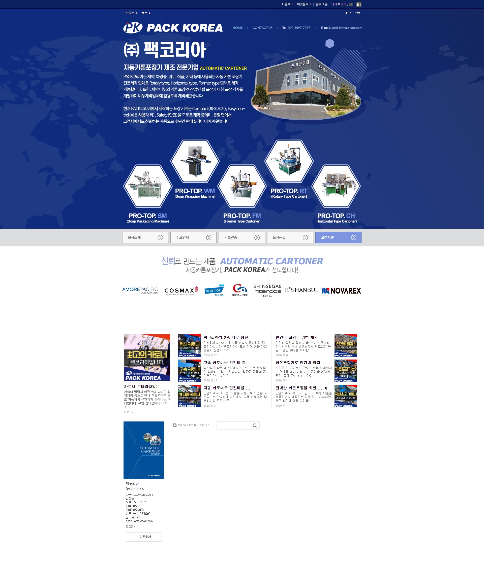 | 프로젝트 | 자동카톤포장기 제조 전문기업 팩코리아의 공식홈페이지형블로그 디자인 제작, 블루톤을 포인트컬러로 하여 디자인을 하였으며, 헥사곤 모양과 배경은 글로벌 시장을 상징하는 이미지를 오버레이하여 적용하였습니다. 팩코리아의 주요제품이 드러나도록 메인 메뉴에 이미지형 배너를 셋팅하였습니다. 또한, 홈페이지와 연동되는 메뉴를 셋팅하였고, 전체적으로 깔끔하고 세련된 디자인으로 제작하였습니다. 기업블로그의 경우에는 깔끔하고 심플한 디자인을 보통 많이 선호하며, 전체적으로 신뢰할 수 있는 분위기와 텍스트로 디자인이 됩니다. |