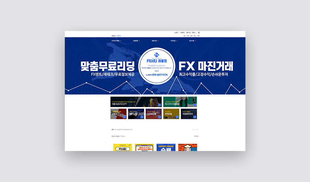 | 프로젝트 | 기존에 진행했던 곳에 같은 내용의 또 다른 컨셉의 홈페이지형블로그 디자인입니다.  이번에 작업한 것도 마찬가지로 세련되면서도 깔끔한 느낌을 내기 위한 디자인으로 제작되었습니다. 또한, 상단 스킨의 이미지만 봐도 어떤 내용을 다루는 블로그인지 느낄 수 있도록 제작되었습니다. 메인 텍스트에 「맞춤무료리딩 / FX마진거래」라는 텍스트를 제목 타이틀로 설정하였고 바로 아래 서브 텍스트 디자인을 적용하였습니다. 남색 계열의 컬러를 사용하여 심플한 느낌을 살렸으며, 고객들이 신뢰를 할 수 있는 분위기를 구성하였습니다. 뭐, 디자인이라는 게 사실 이런 저런 얘기할 것이 별로 없고 느낌적으로 표현해야 하는 부분들이 있는데, 어떤 작업 컨셉을 통해서 작업을 했는지 간단하게나마 설명을 작성하는 것이 작업을 의뢰하시는 분들이 조금이라도 참고할만한 내용이 있을 것 같습니다. 메인 상단 부분 외에 바로 하단에는 위젯 형태로 메뉴가 구성되어 있습니다. 소배너 형태로 각각 제작되어 삽입되었고, 각 메뉴에 해당하는 링크를 좌표링크로 모두 연동하였습니다. 참고하시길 바랍니다.  |
