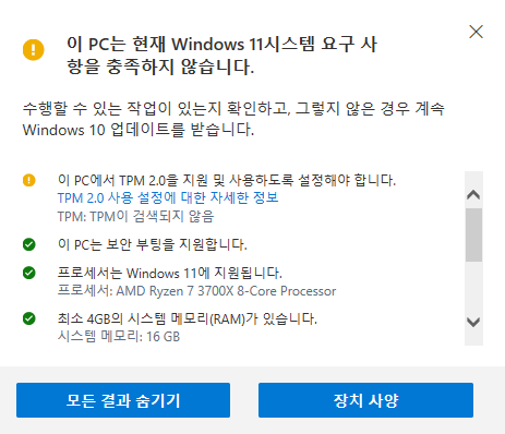 이 PC는 현재 Windows 11 시스템 요구 사항을 충족하지 않습니다.