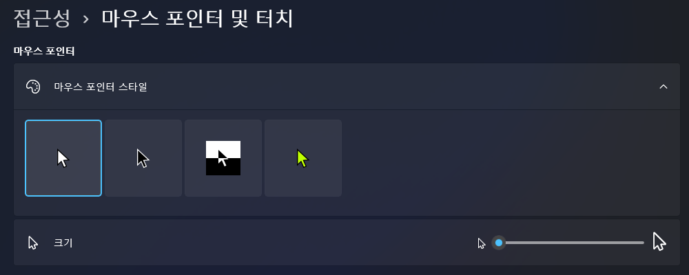 윈도우 11에서는 조금 더 스타일리쉬한 포인터 스타일을 제공합니다. 눈이 침침하거나 마우스 포인트가 잘 안보인다면 마우스 포인트를 크기를 키울 수 있습니다. 윈도우 검색에서 마우스 설정을 찾거나 제어판에서 설정이 가능합니다.