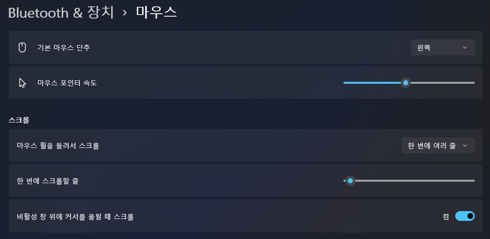 윈도우에서 마우스 설정은 위의 기준은 윈도우 11을 기준으로 설명드리지만, 윈도우 10에서도 동일한 기능입니다.