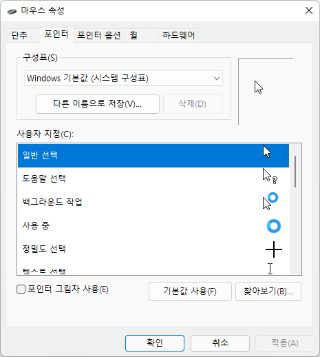 제어판에서 직접 마우스 속성을 확인해보면, 정말 다양한 마우스 포인터를 구성할 수 있습니다. 개성 있는 마우스 포인트로 PPT 발표를 해야 할 때, 더욱 주목받을 수 있을지도 모릅니다. 조금이라도 더 개성을 찾아보면 어떨까요?
