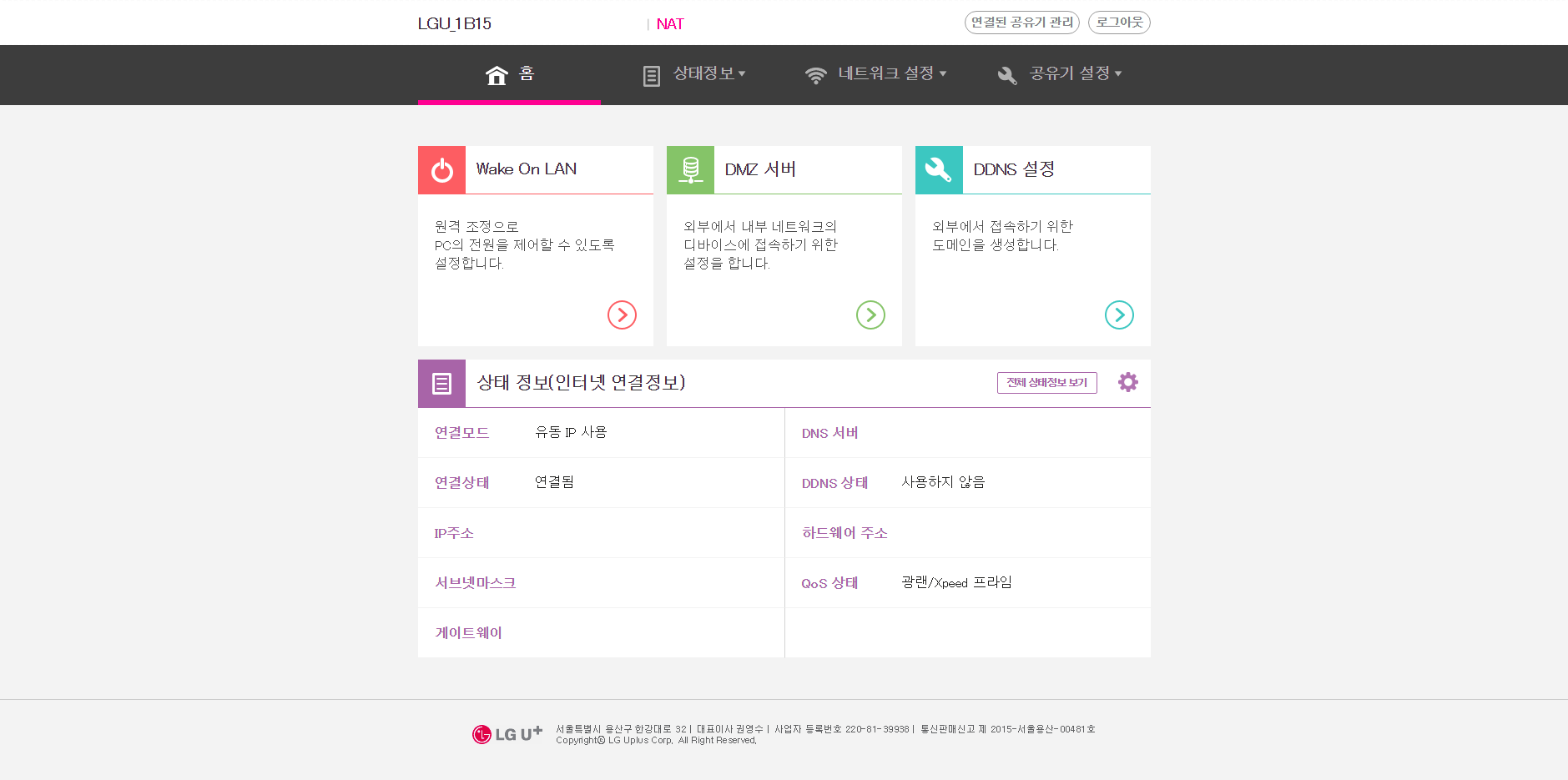 위의 LGU_1B15 공유기가 설치되어 있는 곳을 확인하시고 공유기 뒷면에 보면 #이 포함된 비밀번호가 있을 것입니다. 별도의 메모지에 메모를 한 다음에 위의 주소로 접속하고 공유기를 클릭하면 관리자로 접속이 가능합니다.