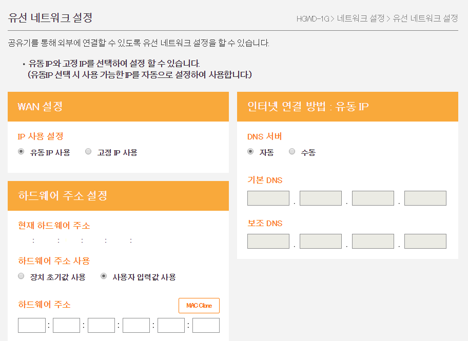 위의 방법이 이해가 가지 않는다면 MAC Clone 옵션을 클릭해서 원하시는 주소값을 설정해주시면 됩니다. 이렇게 해서 LG U+ 아이피 변경하는 방법을 알아보았습니다. IPTIME 방법은 잘 알려져 있는 방면, LG U+ 공유기의 IP주소 변경방법은 잘 알려져 있지 않아서 글을 작성해봤습니다.