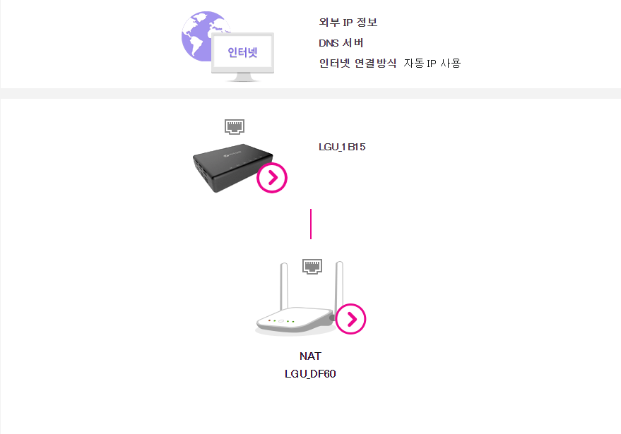 IPTIME과 달리 LG U+ 공유기는 기본게이트웨이 주소가 다릅니다. 따라서 공유기 관리자로 접속하기 위에서는 아래의 주소로 접속을 해야합니다. 인터넷이 구축되어 있는 환경은 각 집마다 다릅니다. 저 같은 경우에는 아파트에 설치가 되어 있고 기본 설비 아래에 모뎀 역할인 상위 공유기가 있고, 그 아래에 TV나 컴퓨터, 휴대폰 등을 연결하는 하위 공유기가 설치되어 있습니다.