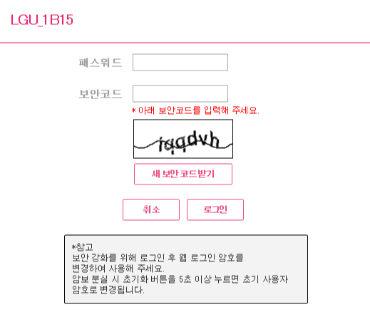 별도의 아이디는 입력할 필요가 없습니다. IPTIME의 경우에는 ADMIN 으로 로그인이 가능하지만, LG U+의 경우에는 비밀번호만 있으면 됩니다. 적었던 메모지의 관리자 비밀번호를 입력하고 보안코드도 함께 입력하고 로그인을 하면 로그인이 가능합니다. 관리자 비밀번호는 별도로 변경이 가능합니다. 추후 보안을 위해서 변경을 해주시는 것이 좋고 나중에 비밀번호를 잊어버리거나 분실한다면 공유기를 초기화 시키면 다시 관리자 비밀번호로 접속이 가능해집니다.