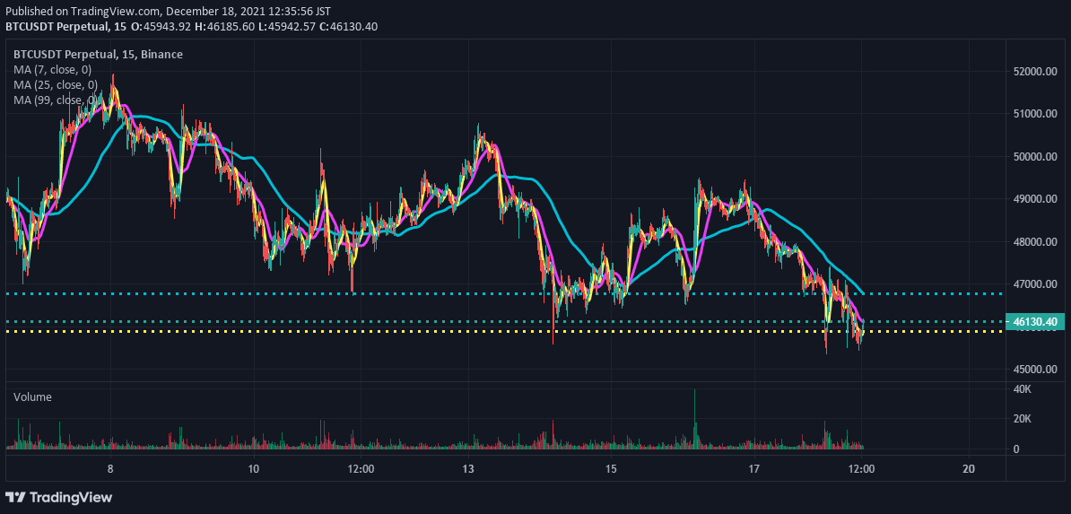 위와 같이 15분봉으로 보더라도 파동이 지나치게 심하고 상승과 하락폭이 무려 3~4천 달러 정도의 변동폭이 있음을 알 수 있다. 20배 레버리지 선물을 한다면 충분히 청산당하고도 남을만한 구간이기 때문에 매수에 주위를 할 수밖에 없다.