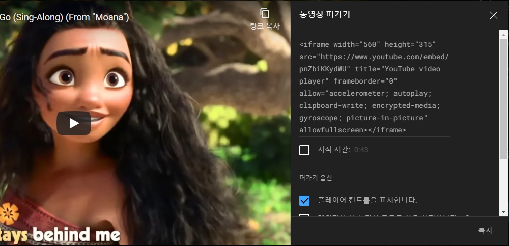 먼저, 유튜브 동영상의 주소 값을 알아야 한다. 일반적으로 유튜브 동영상 주소의 맨 마지막에는 영상의 고유 주소가 있다. 혹은 유튜브 동영상 공유 버튼을 클릭하면 동영상 퍼가기 기능이 나오며, iframe으로 코드를 얻을 수 있다.