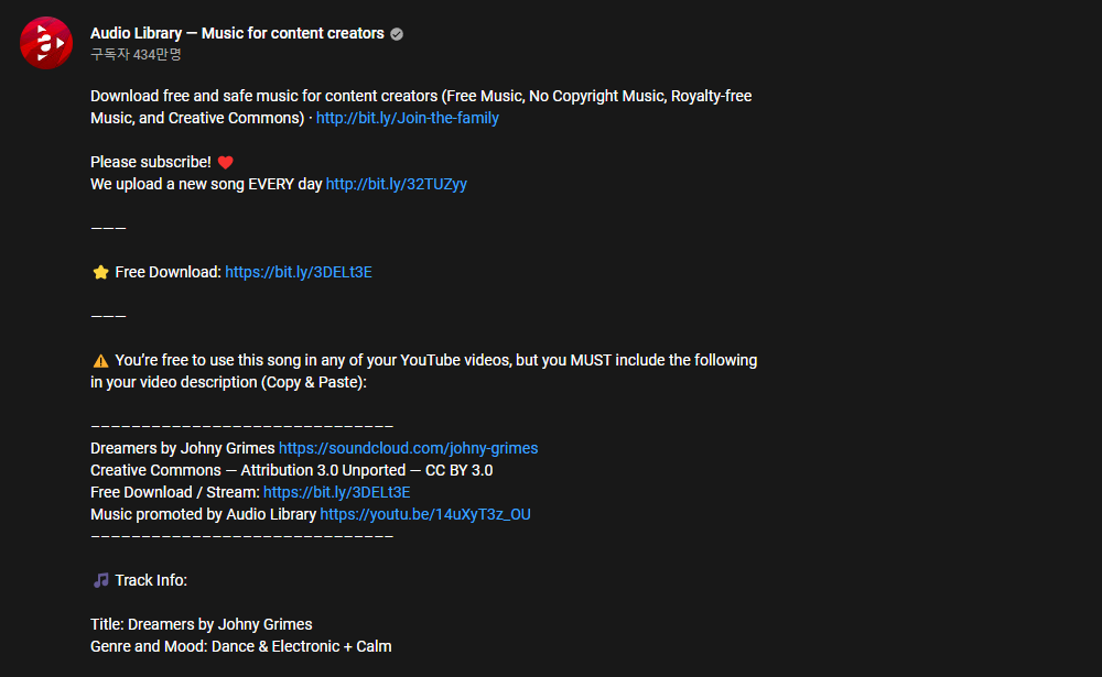 사용 시에는 링크와 함께 설명문을 추가해주시면 됩니다. 다양한 분위기와 장르, 아티스트들의 음악을 저작권 문제없이 무료로 사용이 가능합니다. 크리에이터 여러분들의 멋진 영상을 기대합니다.