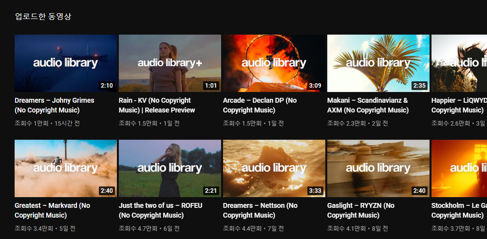 또한, 위의 오디오 라이브러리 홈페이지에서도 음악 파일을 내려받을 수 있습니다. 퀄리티 좋은 영상 속에 포함된 다양한 음악들이 어떻게 영상과 어우러지는지 확인할 수 있습니다. 또한 공식 유튜브 채널도 있는데, 이곡의 영상들을 음원 파일 변환 사이트에서 파일로 내려받아 사용할 수 있습니다.