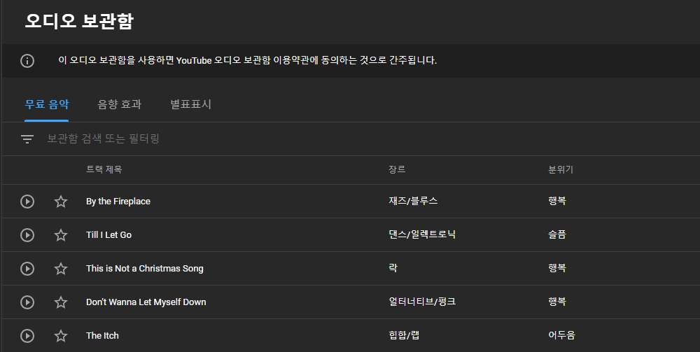 기본적으로 유튜브에서는 크리에이터를 위한 저작권 무료 음악을 제공하고 있습니다. 유튜브 스튜디오 내에 오디오 보관함 혹은 오디오 라이브러리에서 음악을 찾을 수 있고 저장 및 내려받기도 가능합니다. 총 1,710개(오늘 기준)의 음악 파일이 있어 꽤 괜찮은 배경음악 등을 무료로 사용할 수 있습니다.