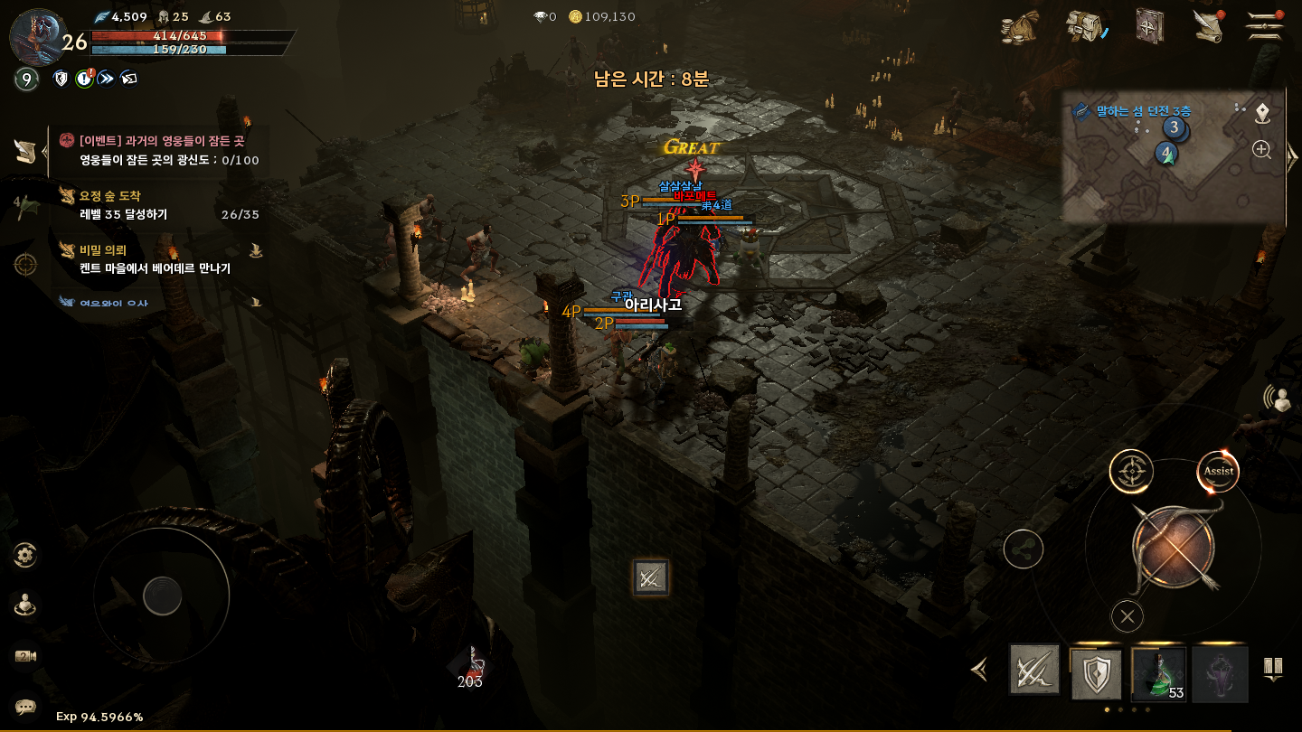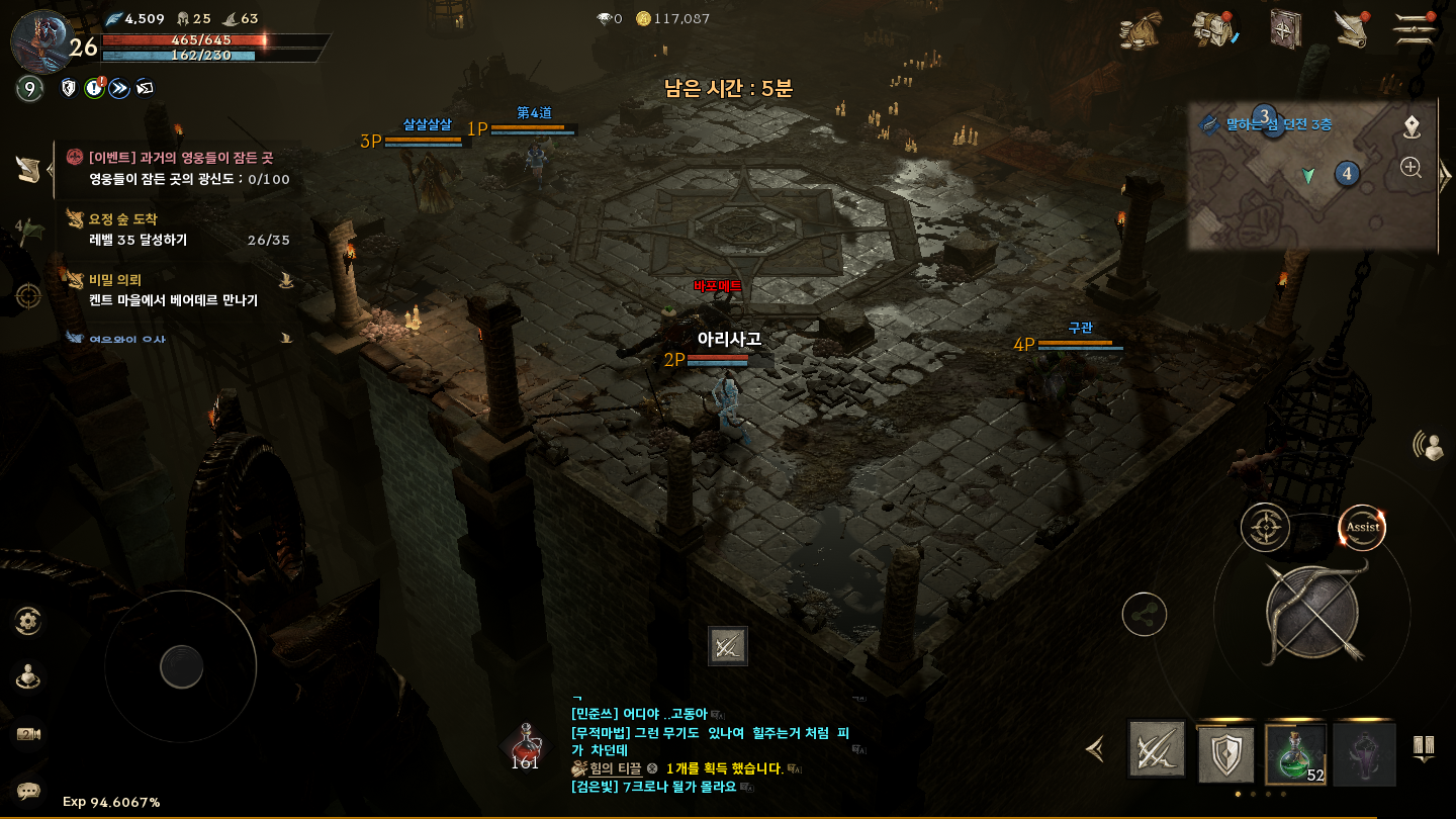 파티 던전으로 들어간 말하는 섬 던전 바포메트, 4인 랜덤 매칭으로 플레이 중이며 무과금 리니지W를 즐기고 있는 중이다. 일단 게임을 진행하면서 자동사냥 모바일 게임치곤 생각보다 괜찮은 느낌이다. 과거에 트릭스터M을 플레이했던 경험이 있었는데 NC게임 중에서 리니지 말고 다른 게임은 잘 안 어울리는 것 같다.