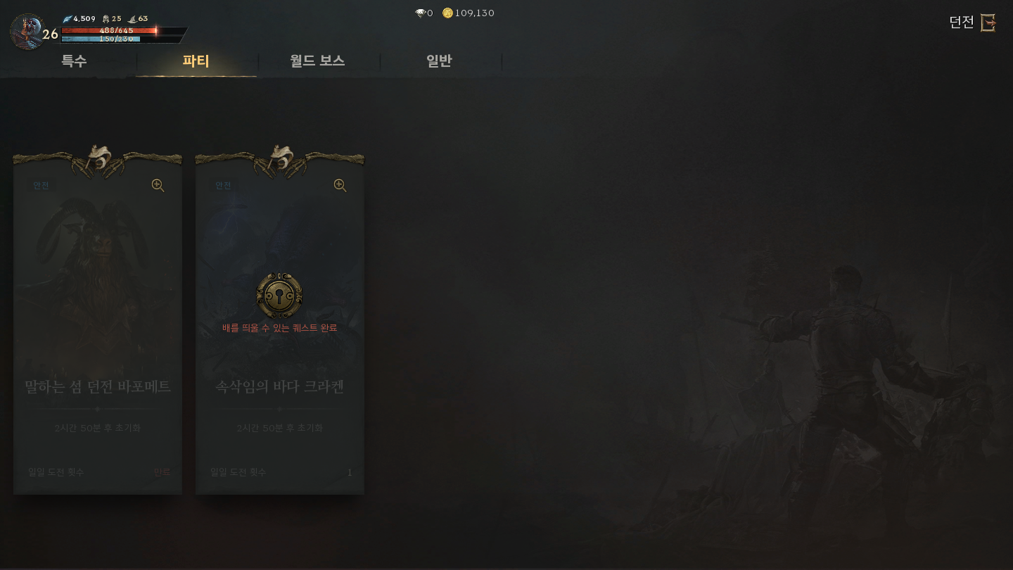 나는 요정 캐릭터로 플레이 중이며, 레벨은 26이다. 파티 던전은 하루에 한 번 플레이가 가능해 보이며, 오전 5시에 초기화되는 듯하다. 일일 도전 횟수가 제한되어 있는 만큼 효율도 좋은 것으로 보인다.