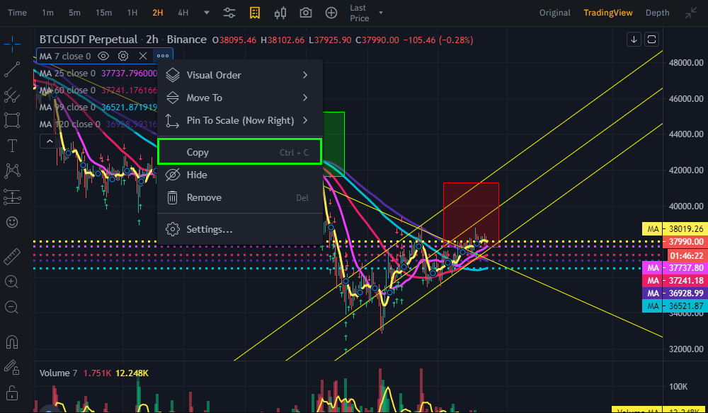 업비트와 바이낸스 등 대부분의 암호화폐 거래소는 트레이딩 뷰 차트를 사용하기 때문에 사용법이 동일합니다. 따라서, 바이낸스 기준으로 이동평균선 세팅을 한번 해볼까요.