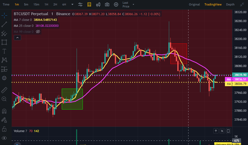 거래량이 크게 발생하진 않았지만, 일시적으로 노란색 실선이 자주색 실선을 뚫고 아래로 내려가는 구간에서 큰 매도가 발생했습니다. 그러나, 놀랍게도 거래량이 크지 않고 그다음 구간에서는 매수가 올라왔기 때문에 다시 가격이 반등하는 모습입니다. 이처럼, 짧은 시간 동안에 예민한 차트의 변화를 읽고 단타 지점을 찾아볼 수 있겠습니다.
