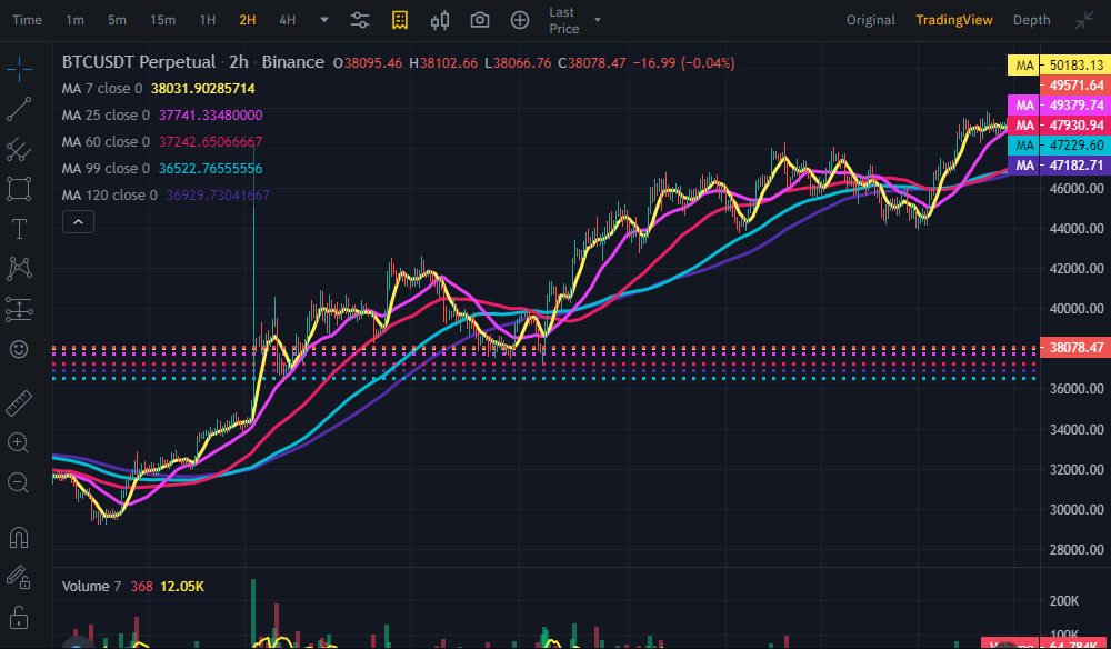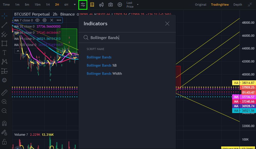 업비트와 바이낸스 등 대부분의 암호화폐 거래소는 트레이딩 뷰 차트를 사용하기 때문에 사용법이 동일합니다. 따라서, 바이낸스 기준으로 이동평균선 세팅을 한번 해볼까요.