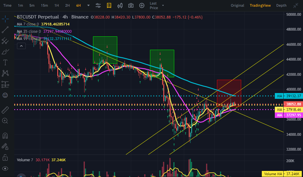위와 같이 7일과 25일의 이평선이 99일 이평선과 맞닿는 부분에서 매우 큰 매도(매수)가 나왔습니다. 큰 폭락이 발생하는 지점인 것이죠. 만약, 99일의 이평선을 뚫고 골든크로스를 만든다면 우리는 이를 추세전환의 신호로 봐도 좋을 것입니다. 그러나 대부분은 긴 하락 추세에서 99일의 이평선(저항선)을 맞고 매도 주문이 급증하게 됩니다. 그리고 매도잔량을 매수 잔량이 소화할 수 있는 정도까지 하락을 이어가는 것이죠.