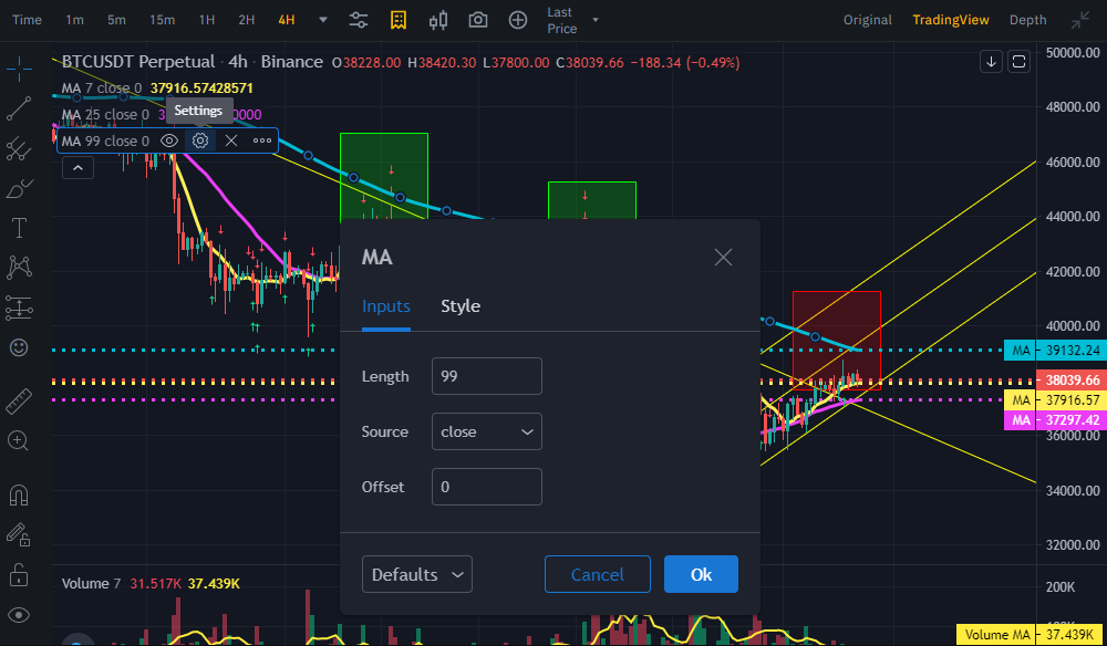 위와 같이 MA(이동평균선)의 톱니바퀴 아이콘을 클릭하면 이동평균선 길이를 설정할 수 있습니다. 여기서 길이(Length)란, 설정한 값만큼의 일수의 가격을 모두 합한 후, 평균값으로 계산한 것을 의미합니다. 따라서, 비트코인의 길이가 짧다면 변동성이 매우 크고 예민하다는 점이 있습니다.