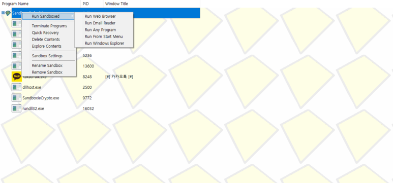 일단 다운로드를 받고 나면 SandBoxie를 실행시킬 수 있는데요, 여기에서 여러가지 프로그램을 실행시킬 수 있습니다. PC카톡 뿐만 아니라 여러개의 프로그램을 실행시켜야 할때, 매우 간편하게 실행시킬 수 있는 프로그램입니다. 위 피자 모양으로 되어 있는 아이콘을 우클릭하면, 프로그램을 실행할 수 있습니다.