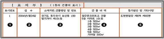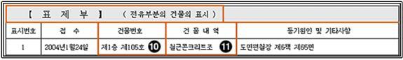 - ④ 건물 내역 : 구조(예 : 철근콘크리트조), 지붕(예 : 슬라브조), 층수, 용도(예 : 아파트), 면적 순으로 표시한다.