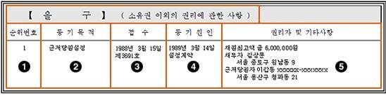 - ① 순위 번호 : 등기한 순서를 숫자로 표시한다. 이 란에 기재된 순위 번호에 의하여 을구 사항란의 권 리간에 우선순위가 결정된다.