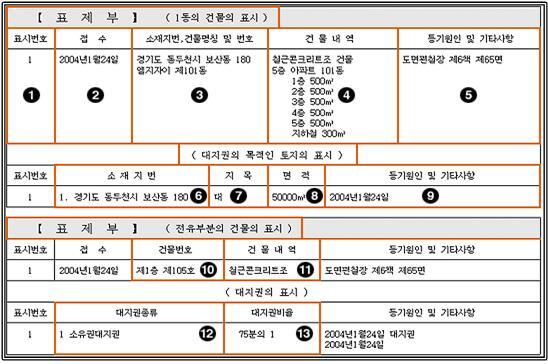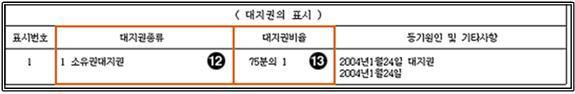 - ⑫ 대지권 종류 : 대지권의 대상이 되는 권리를 표시한다. 소유권·대지권이 일반적이며 그밖에 임차권 대지권, 지상권 대지권도 가능하다.