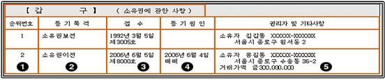 - ① 순위 번호 : 등기한 순서를 숫자로 표시한다. 이 란에 기재된 순위 번호에 의하여 갑구 사항란의 권 리간에 우선순위가 정해진다.