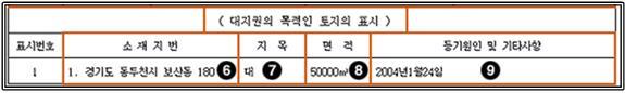 - ⑧ 면적 : 토지의 전체면적을 표시합니다. 등기부의 면적은 ㎡로 표시되어 있다.