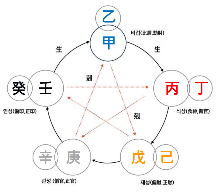 육친은 일간을 중심으로 사주팔자의 각 글자가 일간과 음양, 오행의 차이로 상생상극을 따져 육친을 정합니다.