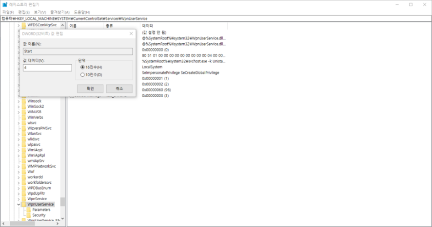 데이터 값을 2에서 4로 변경해주시면 됩니다. 그러면 윈도우키 먹통문제가 잘 해결됩니다. 단위는 16진수로 해주셔야 해요. 가장 간단하게 해결할 수 있는 방법입니다.