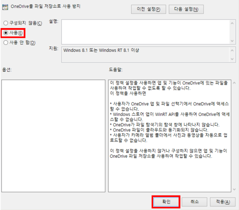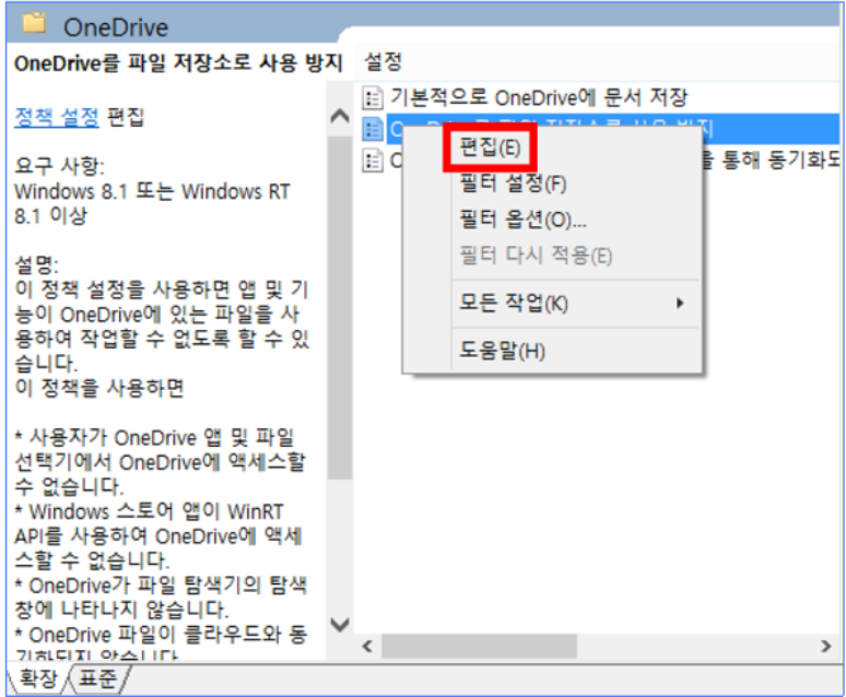 그 다음에 우클릭 하여 편집을 눌러줍니다. 그럼 OneDrive를 파일 저장소로 사용 방지라고 뜨는데요.