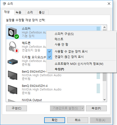 재생장치를 누르신 다음에 스피커가 사용안함으로 되어 있는지 체크해봐야 합니다.