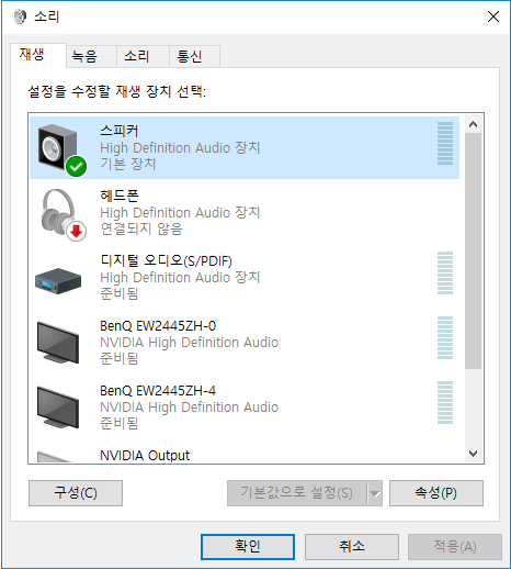 현재 사용하고 있는 스피커의 사용 안 함을 체크해보세요. 저 같은 경우에는 음향기기가 여러 개 사용이 가능하기 때문에 주스피커의 상태를 체크합니다.
