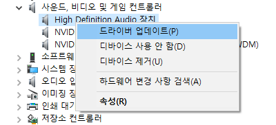 드라이버 업데이트를 하셔서 사운드 드라이버를 최신 버전으로 업데이트를 하거나 디바이스 제거를 클릭하셔서 제거 후 다시 설치해주시면 됩니다.