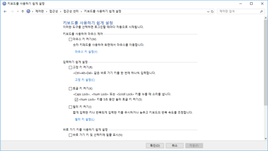 키보드를 사용하기 쉽게 설정할 수 있는 창이 뜹니다. 이곳에서 다양한 기능을 수정하실 수 있습니다. 하지만 키보드 반응속도를 수정하려면 맨 아래로 내려가주세요.