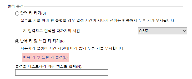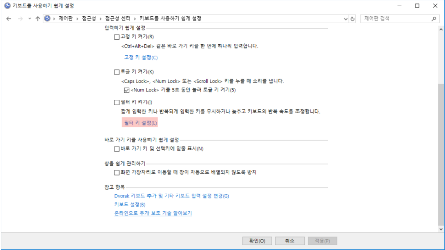 그다음에 다시 키보드를 사용하기 쉽게 설정하기로 들어가서 필터 키 설정을 클릭해줍니다. 들어가셔서 필터 옵션 부분에서 반복 키 및 느린 키 설정을 클릭하셔서 변경해줄 겁니다.