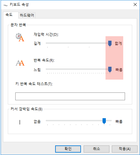 키보드 속성에서 문자반복을 수정해줍니다. 재입력 시간을 최대 짧게해주시고, 반복 속도를 제일 빠름으로 수정해주신다음에 적용 및 확인을 눌러줍니다.