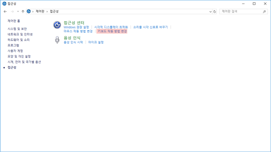 접근성에서 키보드 반응속도를 변경하실 수 있습니다. [키보드 작동 방법 변경]을 클릭해줍니다.