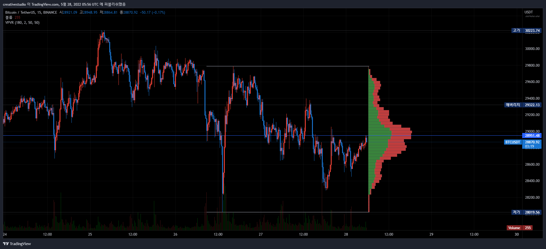 기본적으로 저는 바이비트 현물(BTCUSDT) 차트로 봅니다. 거래량이 가장 많기 때문에 시장의 왜곡이 적다고 판단했기 때문입니다. 매물대는 다들 아실거라 생각됩니다. 해당 지점에서 발생한 거래량이 곧 매물대라고 할 수 있습니다. 예를 들면, 특정 가격대인 3만 달러에서 매수와 매도가 많이 발생했다면 이 지점이 거래량이 됩니다.