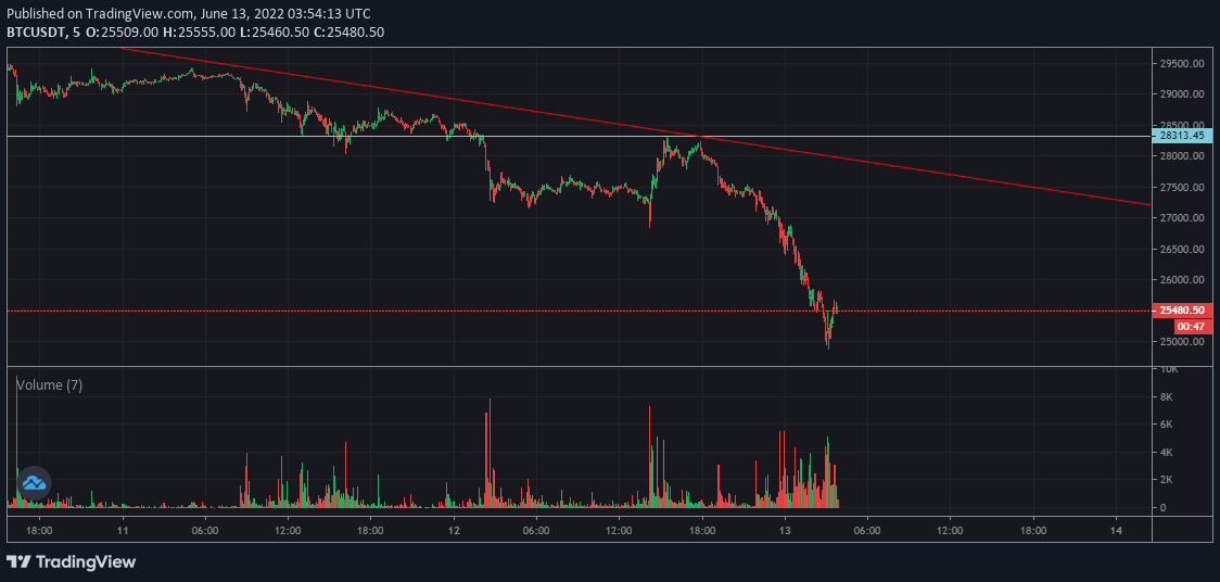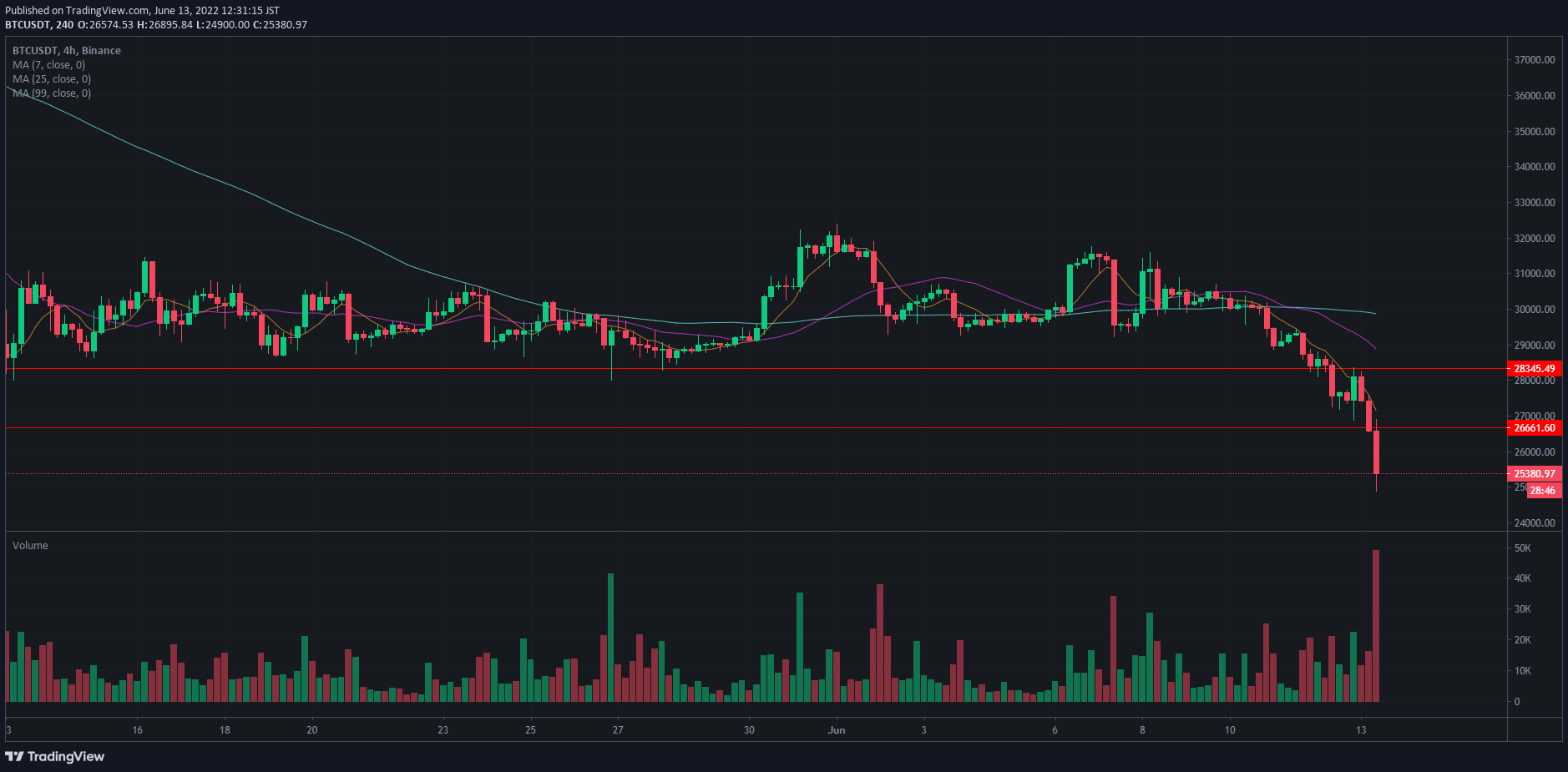 보다시피 위의 차트는 4시간 봉이다. 4시간 봉으로 거래량이 터지면서 숏포지션의 차익실현 매물(롱-매물)이 나왔다. 동시에 25K를 지지하면서 관망 포지션의 사람들이 조금씩 시장에 참여하고 있다. 그러나, 25K 지지구간이 세력을 데리고 어디까지 상승할 수 있을지는 의문이다.