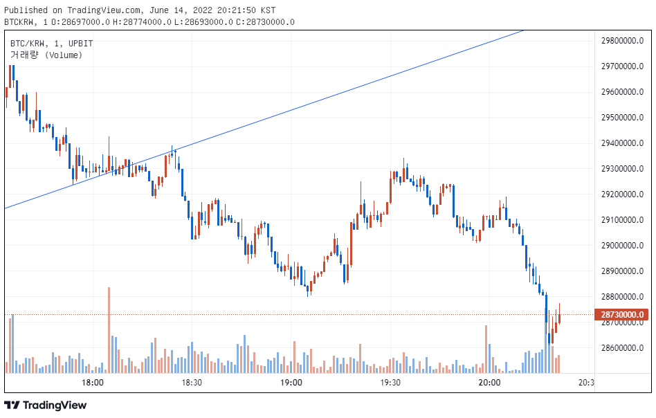 오늘 날짜는 6월 14일이다. 비트코인의 하락세가 심상치 않을 정도로 계단식 하락을 그려가며 빠르게 하락하고 있다. 반등 구간에서 추세선을 뚫지 못하고 하락이 강화되었다. 이렇게 강한 매도세는 매도세의 하락과 매수세의 상승이 정확히 오는 지점에서 멈추겠지만, 문제는 매도세가 너무 강한 것에 비해 매수세가 너무 약하다는 것이다.