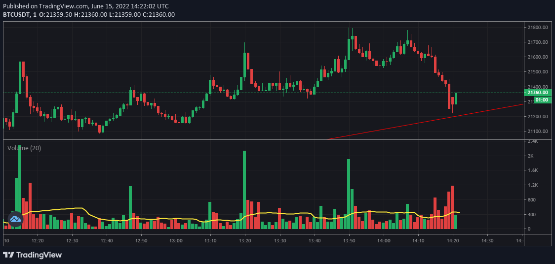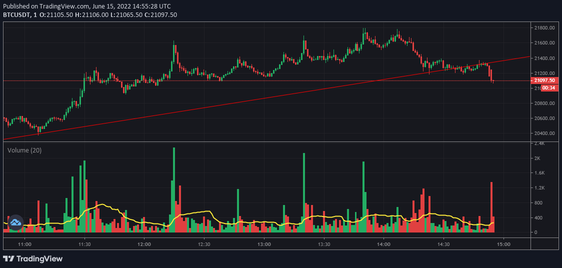 15분봉으로 봐도 큰 폭으로 빠르게 하락하고 있는 모습을 보여주는데, 이때 거래량 또한 크지 않다. 이것이 의미하는 것은 더 이상 매수게 발생하지 않는다는 것이고 매도세력만으로 가격이 크게 하락하고 있다는 것을 의미한다. 즉, 더 아래로 빠질 가능성이 크다는 의미고, 추세선을 지키지 못한다는 의미가 된다.