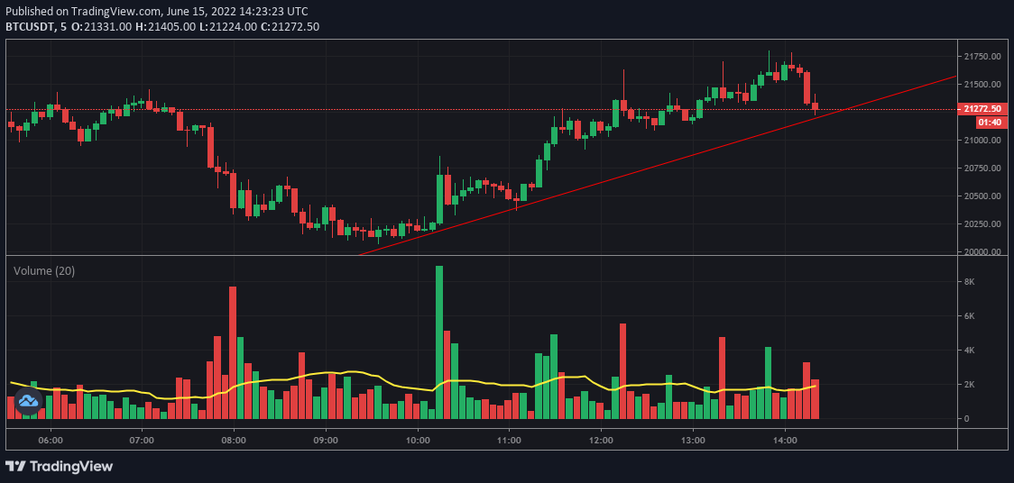 이 글을 쓰고 있는 순간에 이제 매도가 발생하며 서서히 점프를 준비하고 있는 모습이다. 결국 하락장에서는 위와 같이 강한 매수세가 올라오더라도 매도세에 눌리는 경우가 허다하다. 추세선에서 지지를 받고 다시 한번 슈팅할 수도 있겠지만, 계속해서 꼬리가 형성되고 있는 만큼 롱 포지션 버튼을 누르기가 부담스럽게 느껴질 수 밖에 없다.